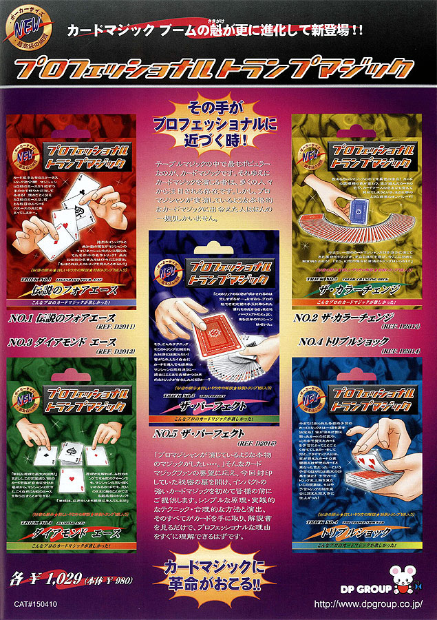 カーディシャン(トランプマジックの愛好家)の皆様にお届けする「プロフェッショナル トランプマジック」シリーズ! まずは、カードマジックの名手たちのステータストリック「伝説のフォアエース」です。マジシャンは3枚のエースを1枚ずつ手の中で鮮やかに消して見せます。そして、煙のごとく消えた3枚のエースは、何と4枚目のスペードのエースの元に集まっているのです。強烈なインパクトと未知数の驚きが、マジシャンのイマジネーションを大いに駆り立てた名作中の名作トリックです。未だに伝説の名手たちは口々にこう言う。「私はこれ以上のトリックを見たことがない!」用具は特製トランプ(ポーカーサイズ?レギュラーデックとしても使用可)にイラストをふんだんに使ったわかりやすいテキストを付けて特別価格でお届けします。カーディシャンならずともこれなら少しの練習でお客様をあっと言わせるカードマジックが演じられるのです。